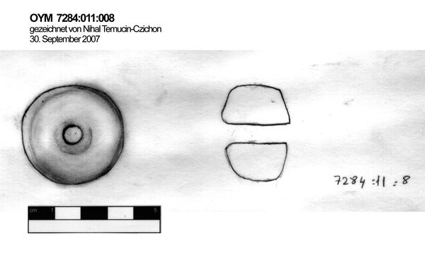 Radförmiger Spinnwirtel mit schwach konisch ausgesprägten Seitenflächen und gleichmäßiger, gerader Durchbohrung; Oberfläche tongrundig hellbraun bis grau und glatt gestrichen; Reste eines ursprünglichen Slips sind noch zu erahnen;
