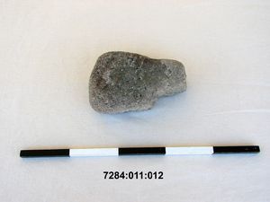 Aus sandigem, grauweißem Konglomerat-Feinkies (Sobott 2016) bestehender, nahezu rechteckiger Stein mit glatter, gerader Unter- und gerader Oberseite (eine Ecke abgeschlagen), der eventuell als Reibstein gedient haben könnte;