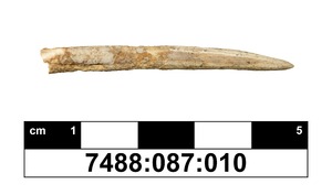 L: 4,48 cm - B: 0,43 cm - D: 0,29 cm - Gewicht: 0,55 g; Datierung: SBZ-jünger Knochenspitze (Nadel, Pfriem?) mit flachovalem Querschnitt und abgebrochenem Ende sowie Spuren von Hitzeeinwirkung;
