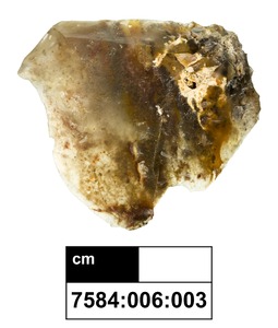 L: 2,93 cm - B: 2,95 cm - D: 0,63 cm - Gewicht: 5,30 gAnnähernd dreieckiger Abschlag aus braunem Hornstein mit zwei unretouchierten scharfen Kanten, die zum Schaben benutzt worden sein könnten.