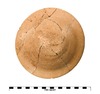 Vollständig erhaltene, aus zahlreichen Fragmenten zusammengesetzte Schale mit Flachboden und zunächst steil ansteigender Wandung, die im oberen Gefäßdrittel in einen stark nach außen gebogenen gerundeten Rand übergeht.