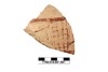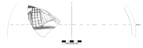 Wandscherbe eines größeren Gefäßes. Drehscheibenware. Der Scherben besteht aus hellbraunen Ton (Munsell color: 7.5YR 6/4), der viel mineralische Magerung von feiner und mittlerer Größe enthält, darunter auffällige rotbraune Steinchen und Kalkpartikel, die bisweilen auch gröber sind. Die Oberfläche der Außenseite ist geglättet und auf der Innenseite sind feine Drehspuren zu erkennen. Die rot braune Bemalung (Munsell color: 2.5YR 4/2-3) zeigt zwei annähernd horizontal verlaufende ca. 0,5 cm breite Linien, die etwa 5 cm weit auseinander liegen. Dazwischen zeichnet sich eine komplexere Bemalung ab. Deutlich erkennbar ist ein vertikal gestelltes Dreierleiterband. Rechts davon ist wohl ein Rechteck mit konkaver Ober- und Unterseite vorhanden, dass mit vertikalen Linien gefüllt ist. Links davon scheint dasselbe Motiv noch einmal vorhanden gewesen zu sein. Dieses Malmotiv ist sehr ungewöhnlich. Das Fragment Fund:7884:001:001:002 ist von der Ware, Wandungsdicke, Oberflächenbehandlung, Malfarbe und vor allem vom Motiv her sehr ähnlich, so dass die beiden Stücke vielleicht zu einem Gefäß gehört haben. Dies trifft auch auf das Fragment Fund:7586:071:001:001 zu, dass sich nur dadurch von den anderen beiden Fragmenten unterscheidet, dass es leicht reduzierend gebrannt ist.