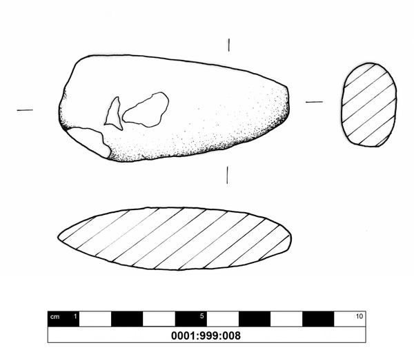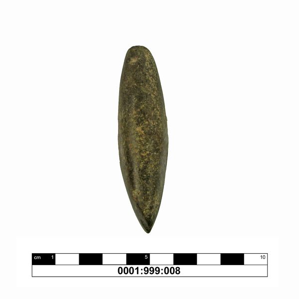 Längliches Beil aus dichtem grünlichem Stein mit sorgfältig polierter Oberfläche; eine Ecke der Hackfläche abgebrochen;