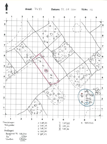Rechteckiger Testschnitt von 1,00 m Breite und 3,20 m Länge zwischen Locus:7487:003 (Nord) und Locus:7487:009 (Süd).