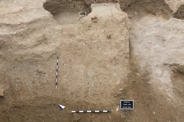 Befund mutet an wie eine Schüttung, die mit einer gedachten Verlängerung des Mauersockels Locus:7586:082 nach SW fluchtet. Gab es hier einen Einschnitt? Liegt der Befund als Schüttung vor 82 oder auf 107?