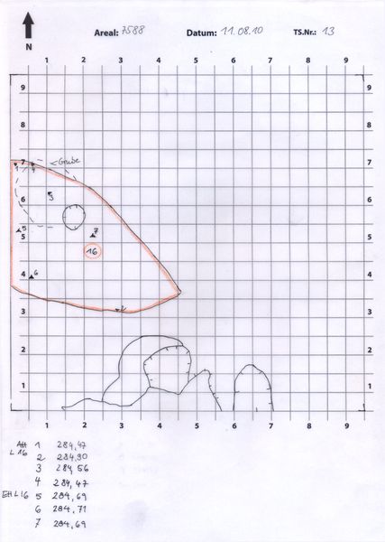 sehr festes graues Material. zahlreiche kleine Kalkstückchen. Kleine Holzkohlestückchen, kleinste Steinchen