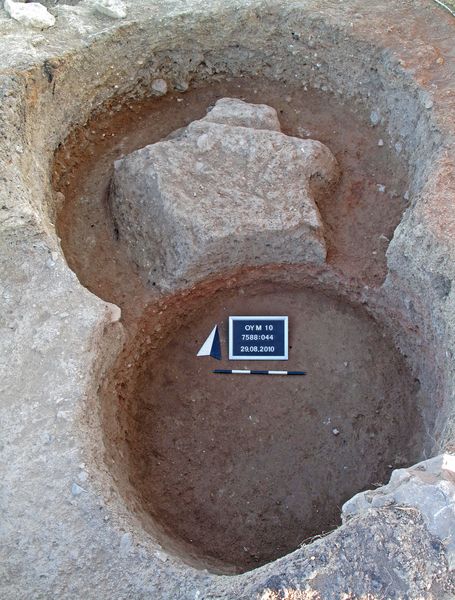 zunächst von Süden geschnitten. Daten der Nägel 1.72/8.14 und 0.86/7.70. Form: konusförmig (?). Das Füllmaterial ist relativ fest, enthält Holzkohle, kleine Kalksteinchen und Steinchen. Die Farbe des Materiales ist graun-gelb. Auf dem Boden (im kleinen Profil gut sichtbar) ein ungebrannter LZ. Jüngeres Füllmaterial Locus:7588:042 legt sich ringförmig um L 44.