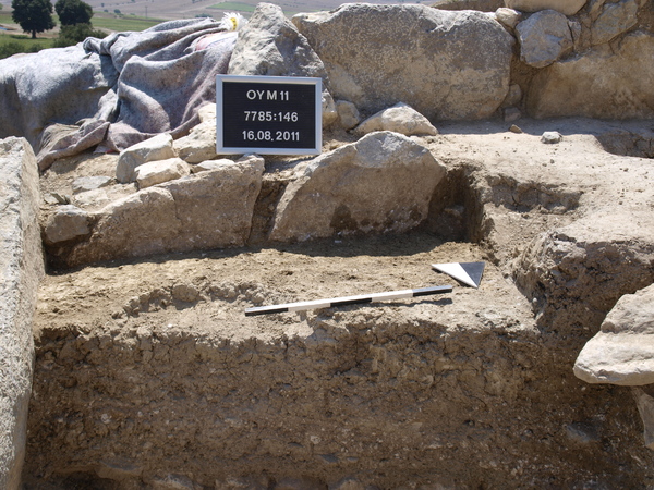 Locus:7785:146 After the section drawing a small test excavation was carried out to see the build up of the layers and to make a section over one of the postholes. This place was chosen on the left side of the exit in front of the large stone Locus:127 and in front of wall Locus:026 . The soil in here is yellow brown thick clayish soil.