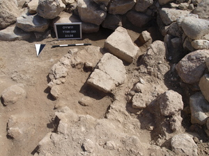 Locus:7786:061 This is the a wide strip was set out over the layer with the reddish burnt mudbrick debris that slopes down from the wall. The idea is to create a section over the debris between Locus:7786:048 and Locus:7785:045. In this debris were two mudbrick fragments that were already exposed and drawn in 2009. It was possible to get some information from them: both have one complete side which length is 36 cm. The broken off sides are 36 and 34 cm and the height / thickness is 13 and 12.5 cm. Many smaller fragments are in the debris. After photographing the pieces were removed and the large fragments were saved for closer studying.