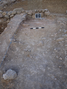Locus:7786:081 , the former [076], was first excavated. This is the top of the strip next -north- to the ‘deep sounding’ In this red burnt debris layer are some large mud-brick pieces and fragments preserved. Some pottery was collected under which one complete profile. Bottom elevations: w 282.68 and e 282.60. Coordinates: East 2.20 till 3.50 and North 5.55 till 6.80