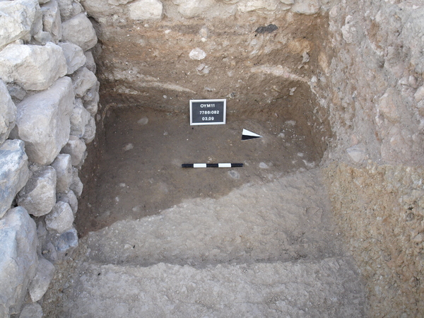 Locus:7786:082 , the former [73], this is the brown soil with burnt remains. The surface get smaller and smaller as the trench gets deeper as a result of the slanting sloping surface of the yellow hard natural soil that was cut deep into the sloop of the mount.