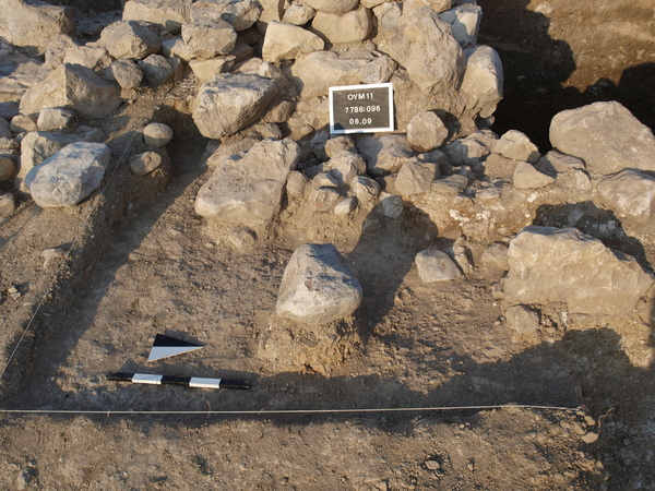 Locus:7786:096 this is the former Locus:7786:075 here more cleaning of stones took place and some more large stones at the bottom of the wall came up. Some smaller stones too. The all are found within the borders of the foundation trench, a shallow grey ditch, shallow as seen now of course and not when dug!