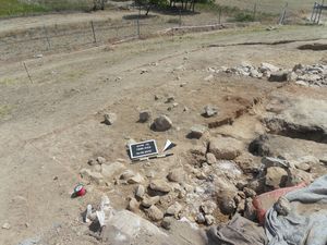 The color of the soil is reddish brown. Its consistency is loose. The soil contains pottery, bone, chalky material, small-medium sized stones and chunks of (burnt) mud-brick.